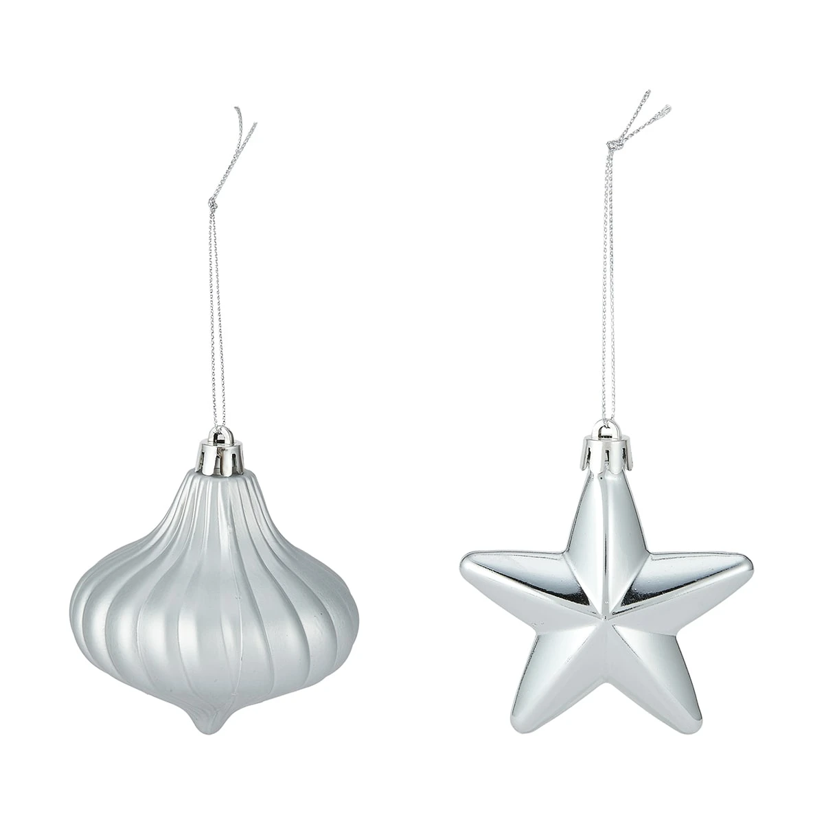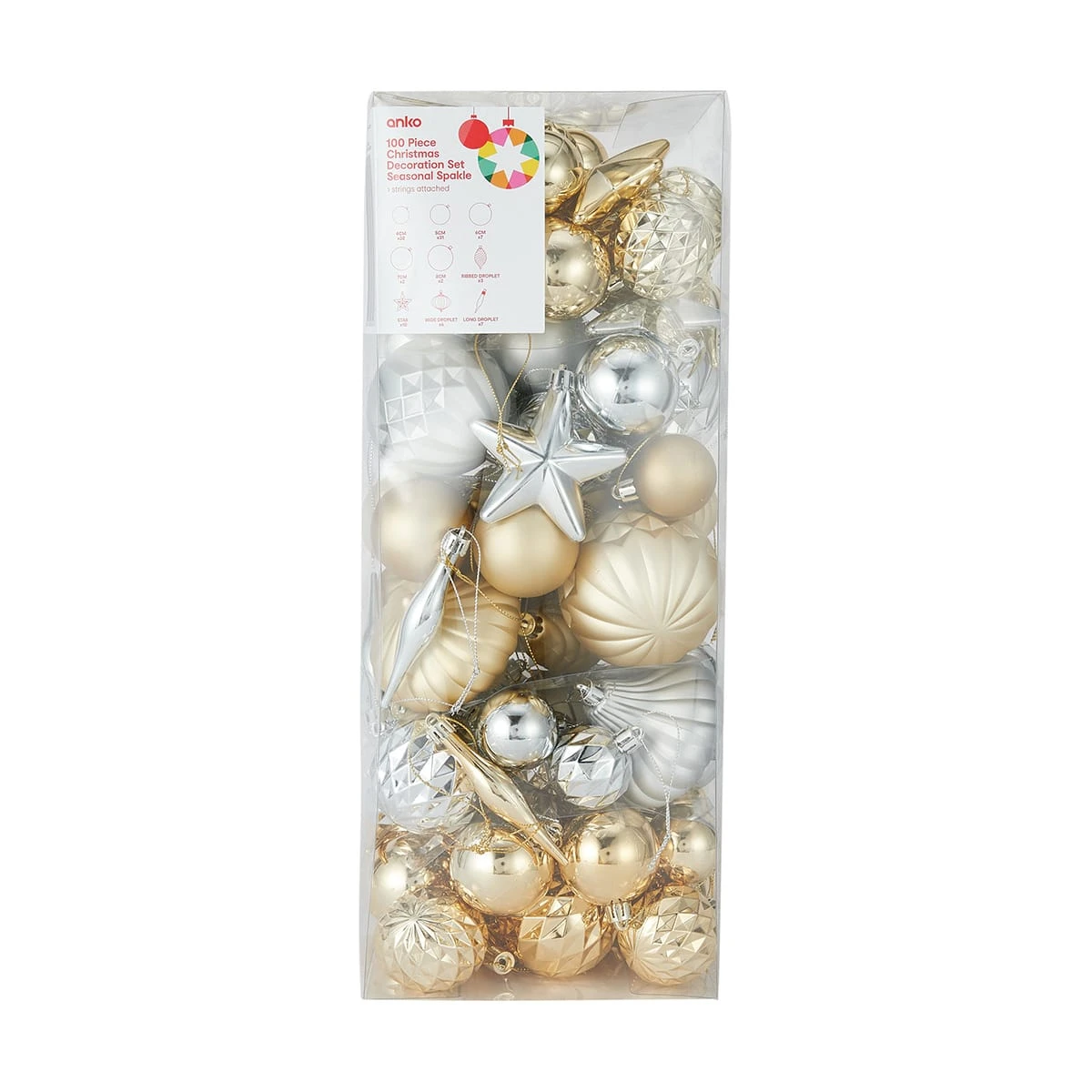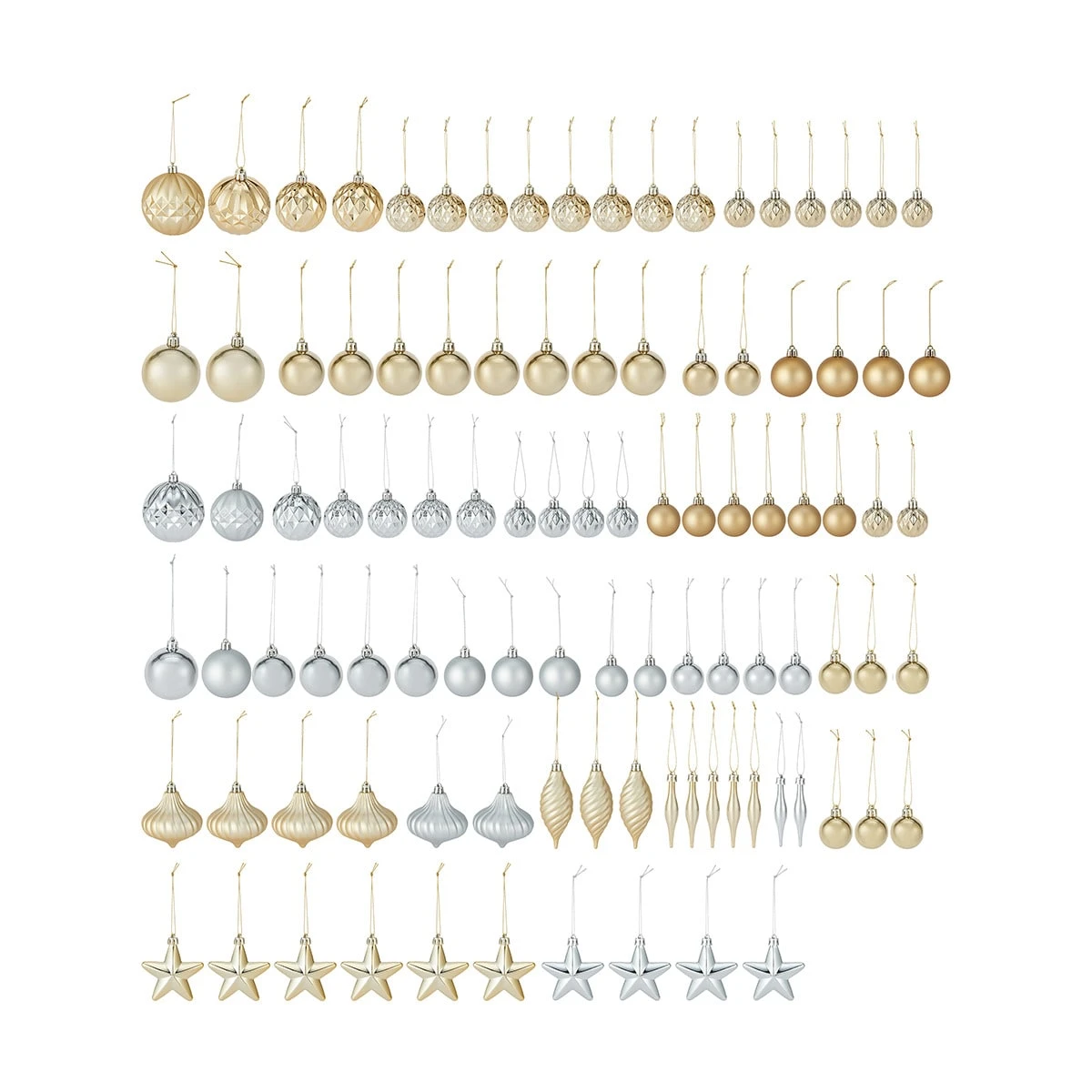 - Includes 32 x 4cm ball, 31 x 5cm ball, 7 x 6cm ball, 2 x 7cm ball, 2 x 8cm ball, 3 x ribbed droplet, 10 x star design, 6 x wide droplet and 7 x long droplet