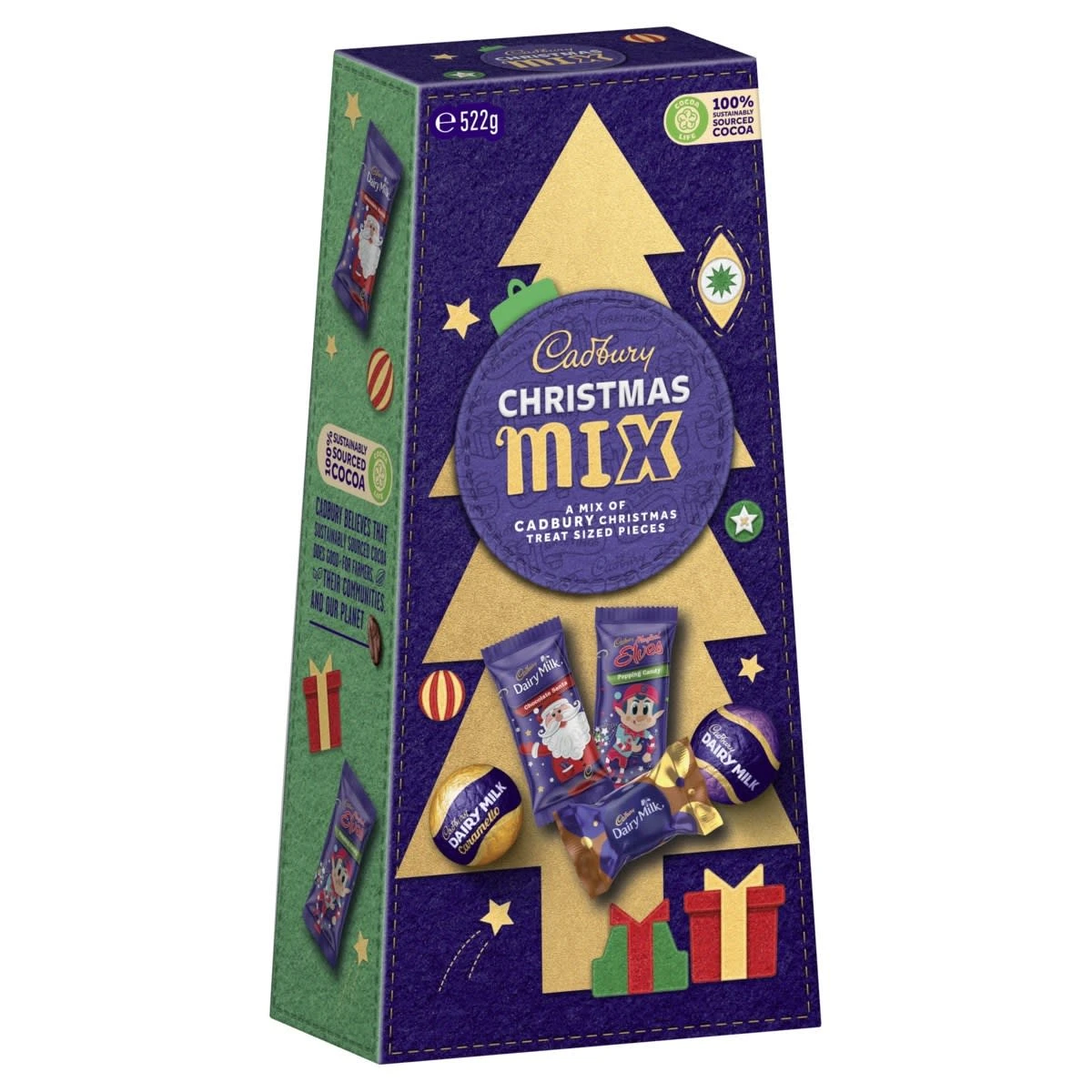 Cadbury Christmas Mix gift box is the perfect way to say Merry Christmas throughout the festive season. The gift box contains a tasty assortment of Cadbury Dairy Milk Milk Chocolate baubles, Cadbury Dairy Milk Caramello baubles, Cadbury Dairy Milk milk chocolate Santas, Cadbury Magical Elves with popping candy, and Cadbury Dairy Milk hazelnut pieces. Each piece is individually wrapped and packed into a uniquely shaped gift box.