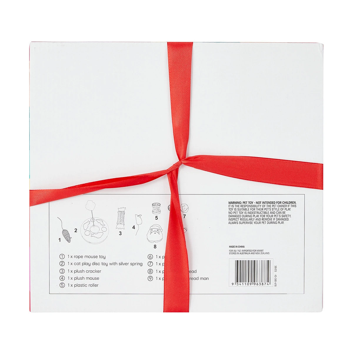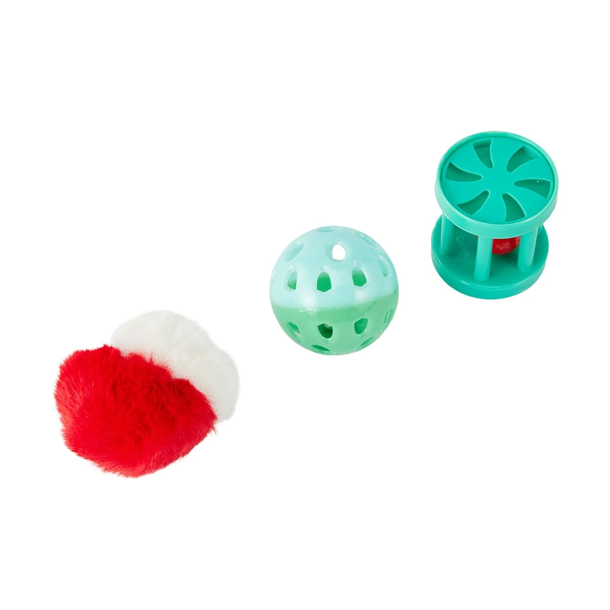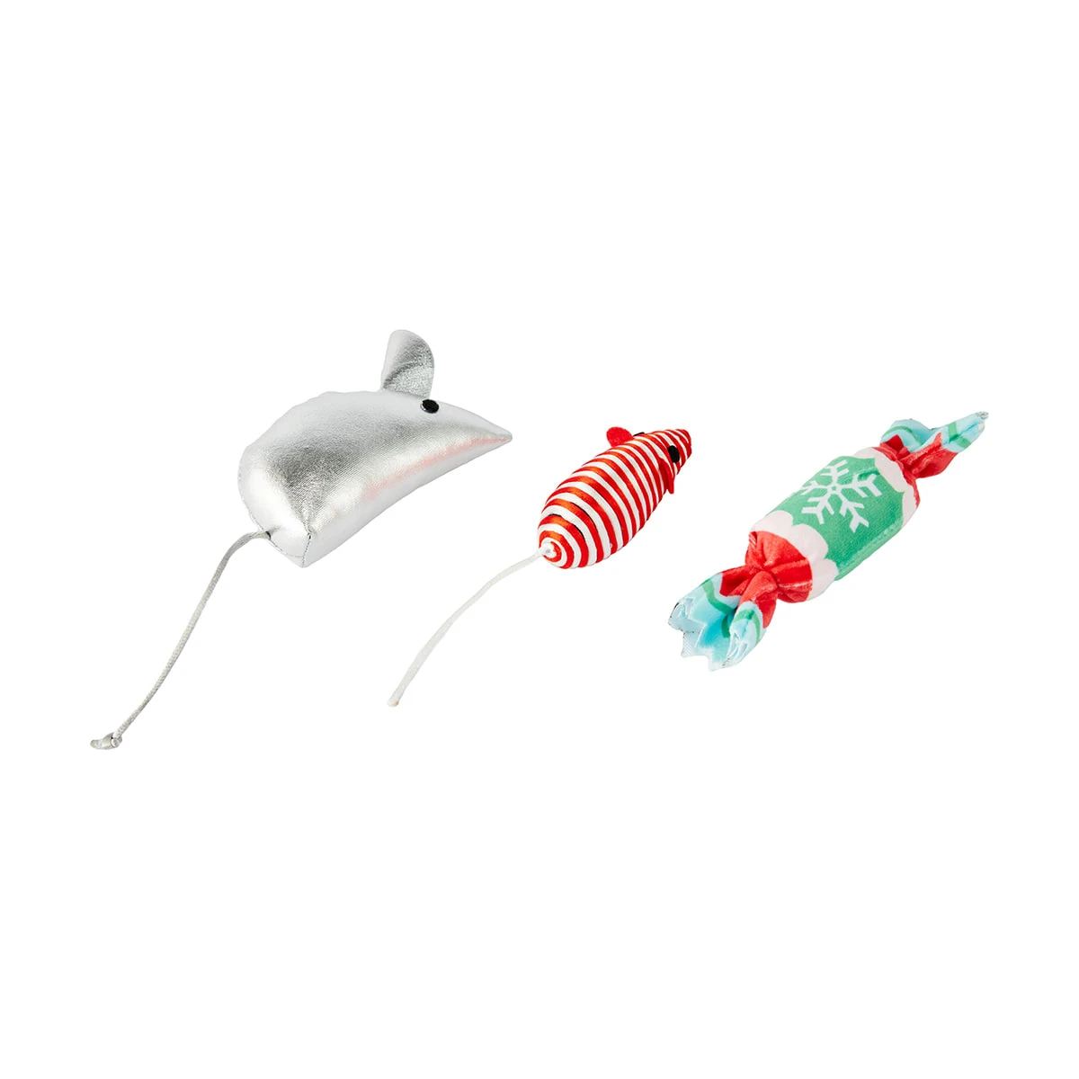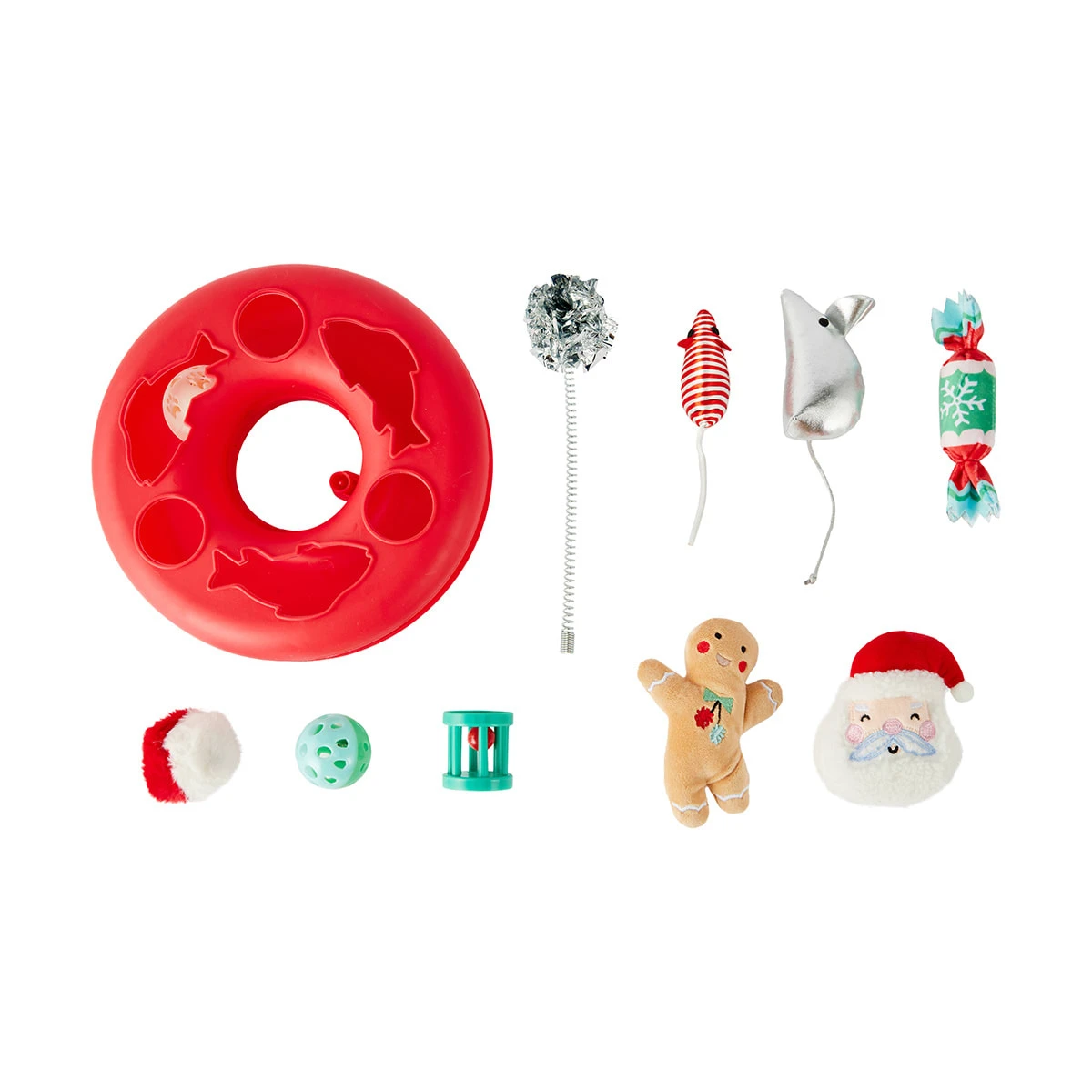 - Includes 1 x rope mouse toy, 1 x cat play disc toy with silver spring, 1 x plush cracker, 1 x plush mouse, 1 x plastic roller, 1 x plastic ball, 1 x plush ball, 1 x plush Santa head and 1 x plush gingerbread man
