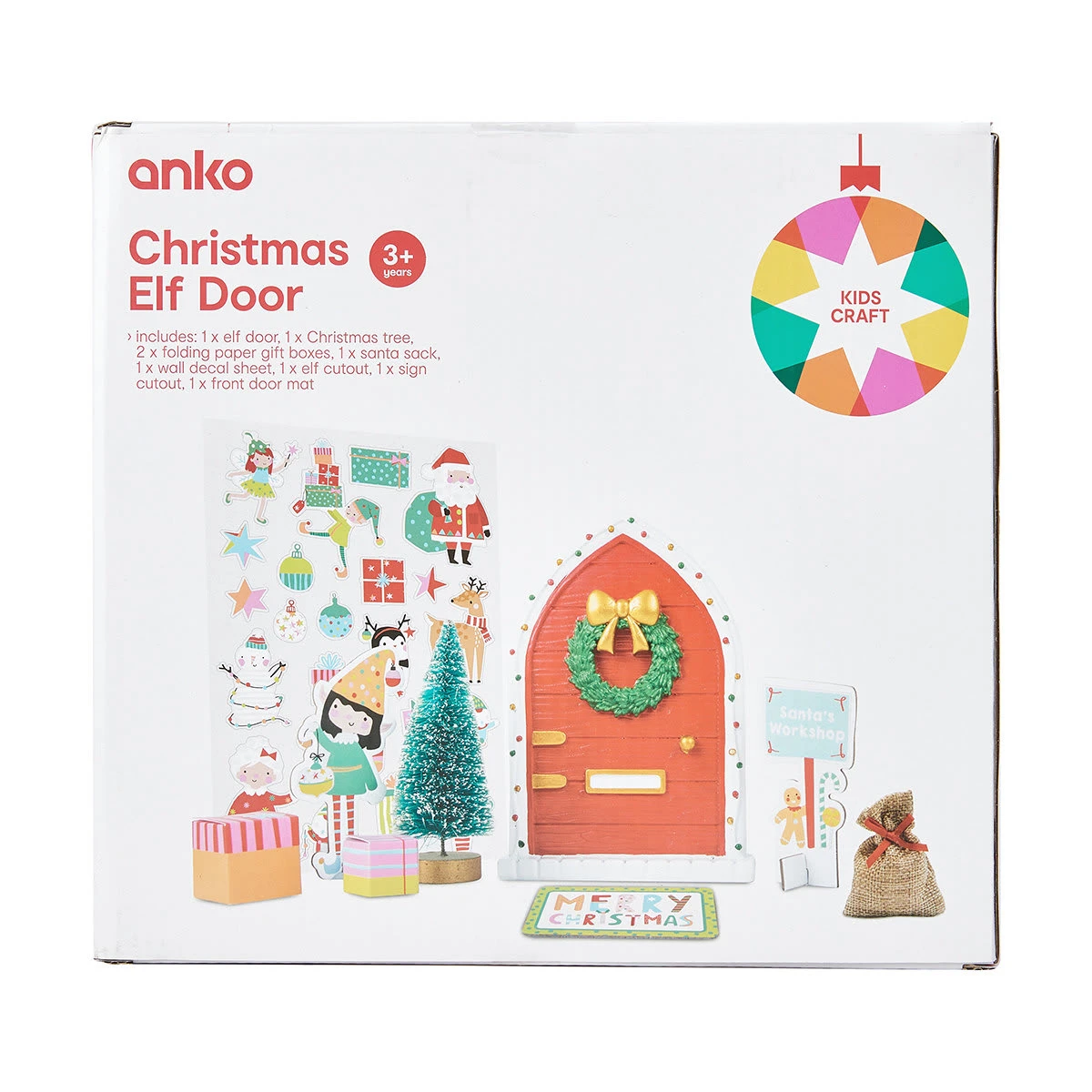 - Includes 1 x elf door, 1 x Christmas tree, 2 x folding paper gift boxes, 1 x Santa sack, 1 x wall decal sheet, 1 x elf cutout, 1 x sign cutout and 1 x front door mat