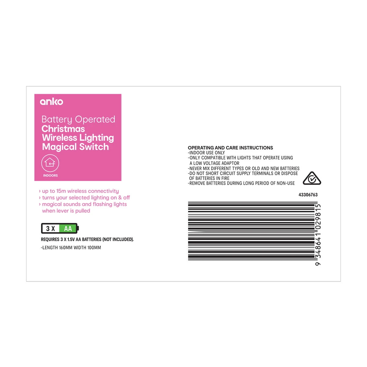 Make this festive season even more fun with the Wireless Lighting Magical Switch. This interactive unit features a lever that will light up with sound when pulled to turn on and off your fairy lights. The battery-operated switch and wireless controller integrates with your low-voltage fairy lights to bring a little magic to your lights!