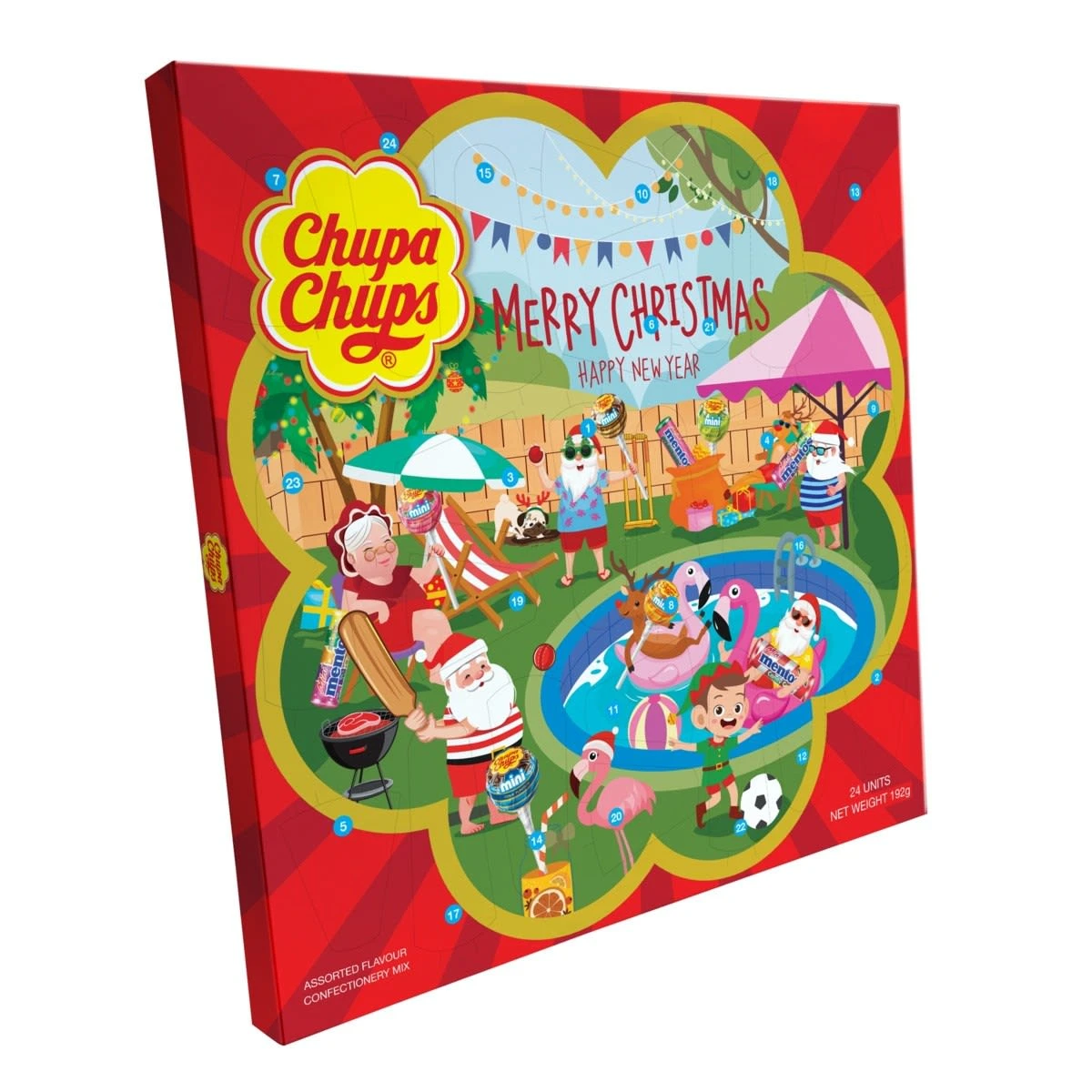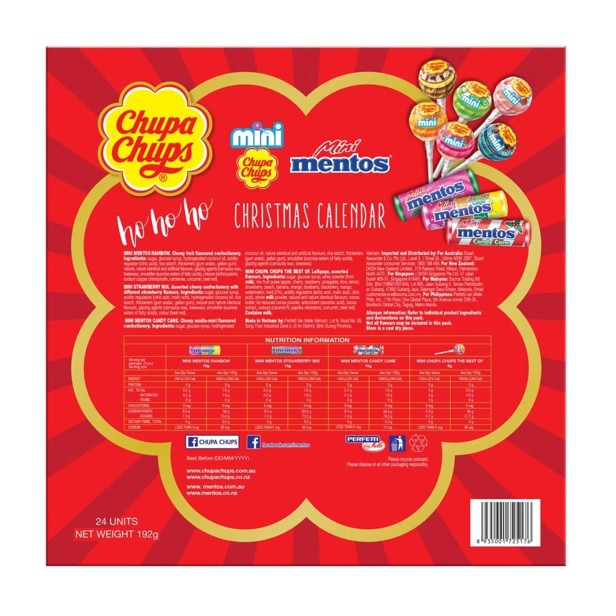 The perfect addition to every Christmas countdown! The mini Chupa Chups and Mentos Advent Calendar – includes The Best of Chupa lollipops in strawberry, strawberry and cream, cola, apple, orange and choco vanilla flavours! Combined with delicious Mini Mentos in the strawberry mix, rainbow and candy cane flavours! This is a perfectly sized daily sweet treat for all ages.