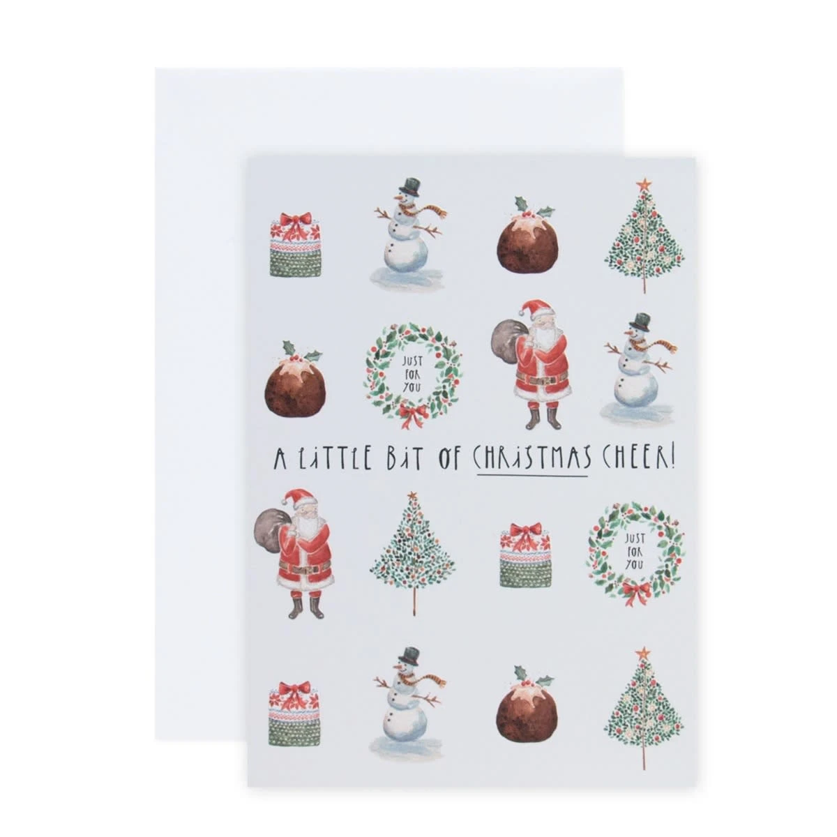- The front of the card features embossed elements, adorable illustrations of a snowman, a Christmas wreath with the message ‘JUST FOR YOU’, a Christmas pudding, a Christmas tree, gifts and Santa Claus along with the message ‘A LITTLE BIT OF Christmas CHEER!’