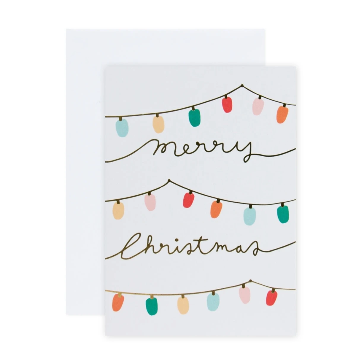 - The front of the cards feature illustrations of colourful string lights, gold foil highlights and the message ‘merry christmas’
