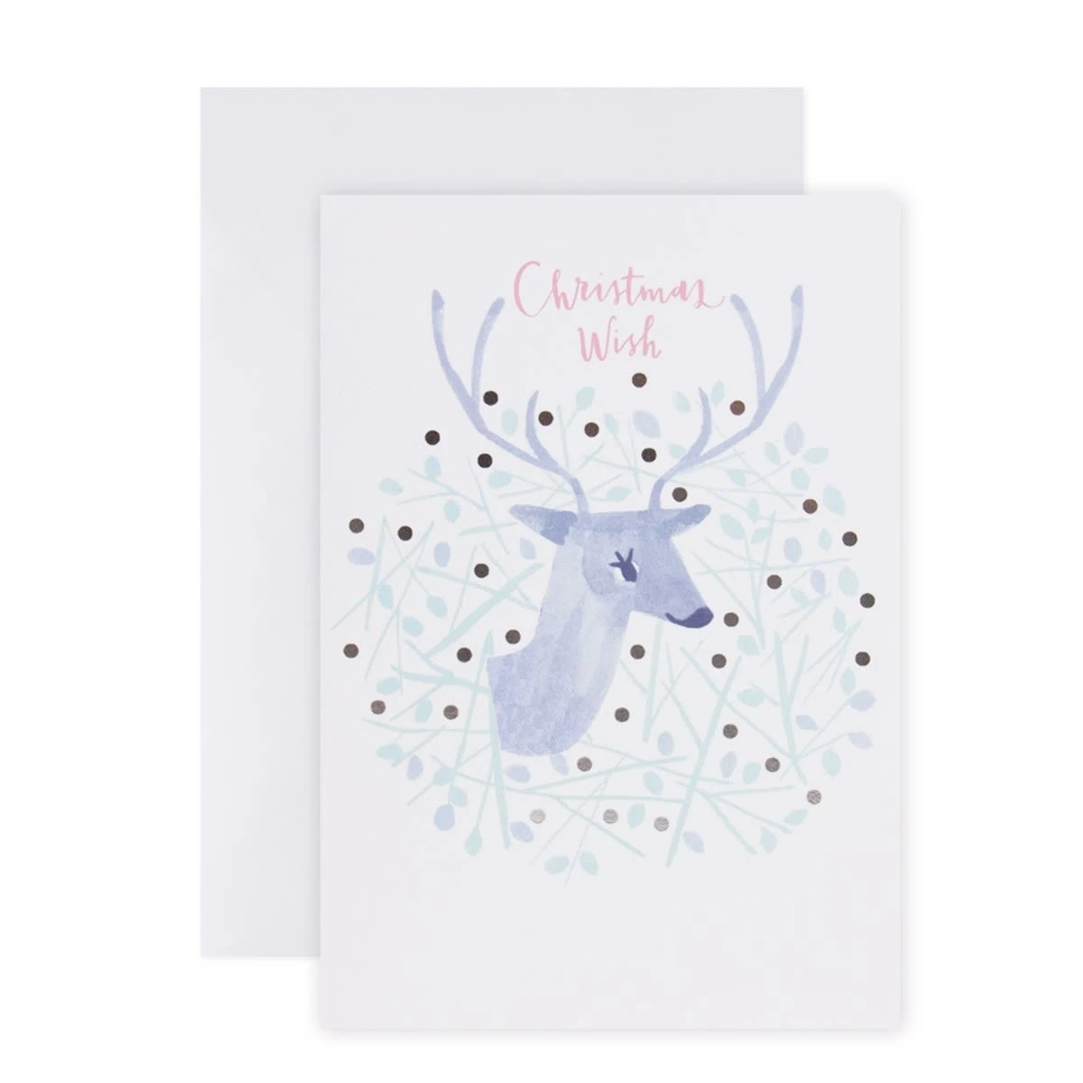- The front of card one features a cute-as-a-button illustration of a reindeer surrounded by branches, silver foil highlights and the message ‘Christmas Wish’