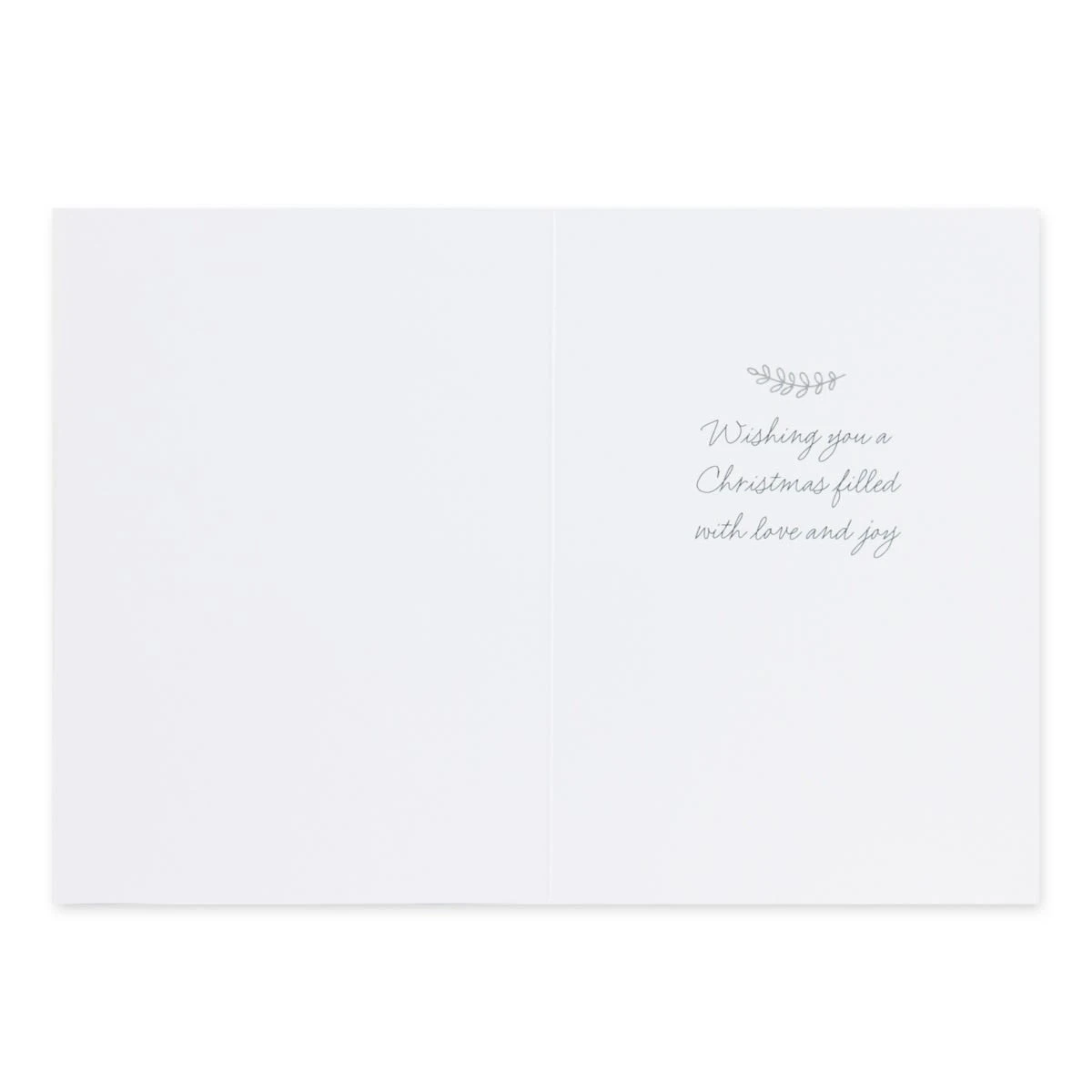 - The inside of the card features an illustration of an olive branch alongside the message ‘Wishing you a Christmas filled with love and joy’