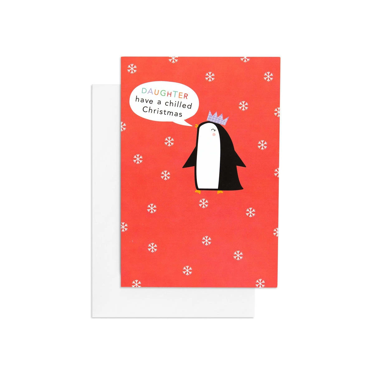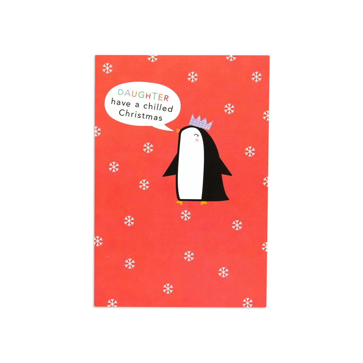 - The front of the card features a sweet illustration of a penguin surrounded by snowflakes and the message ‘DAUGHTER have a chilled Christmas’