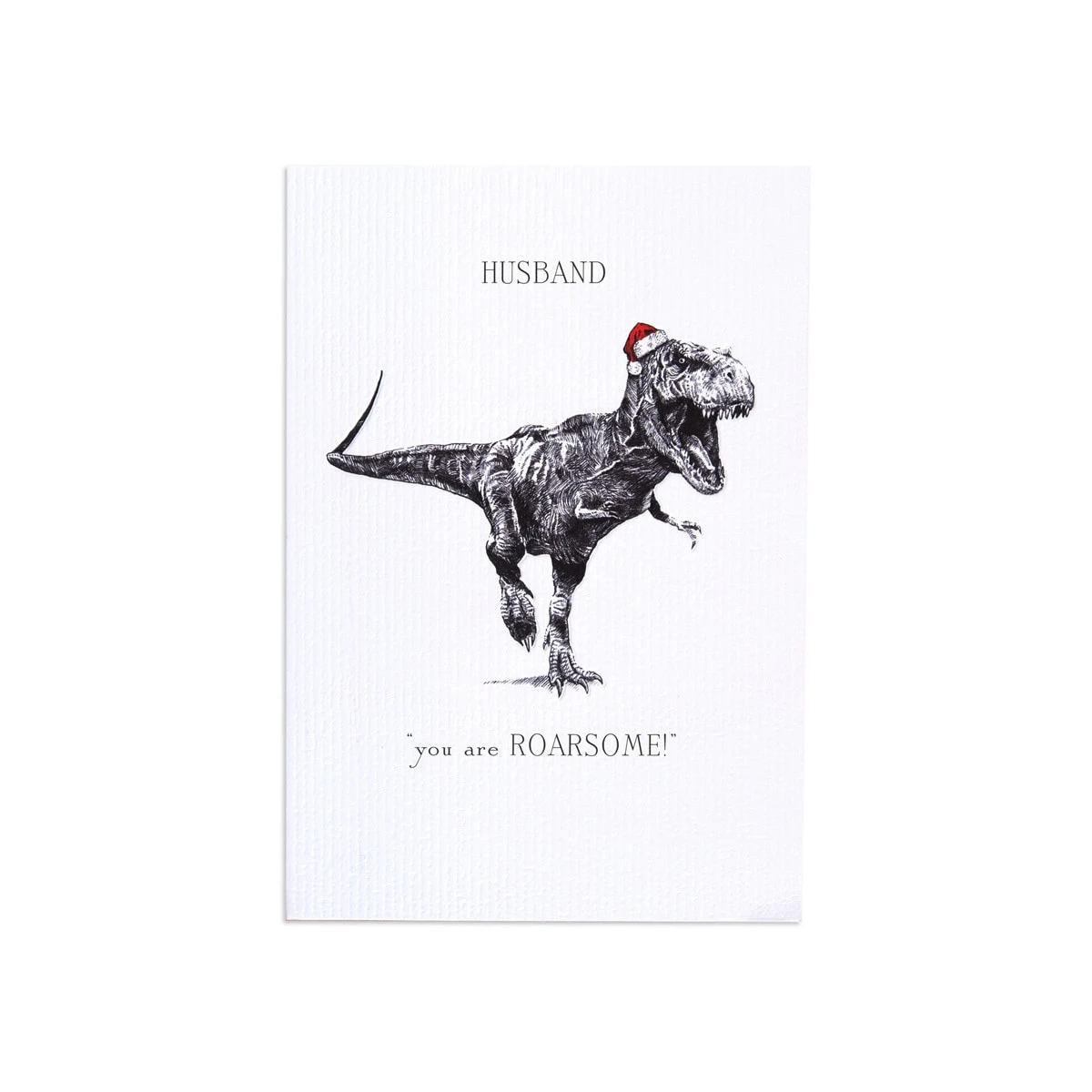 - The front of the card features an illustration of a T-Rex dinosaur wearing a Santa Claus hat, embossed elements, and the message ‘Husband you are Roarsome’