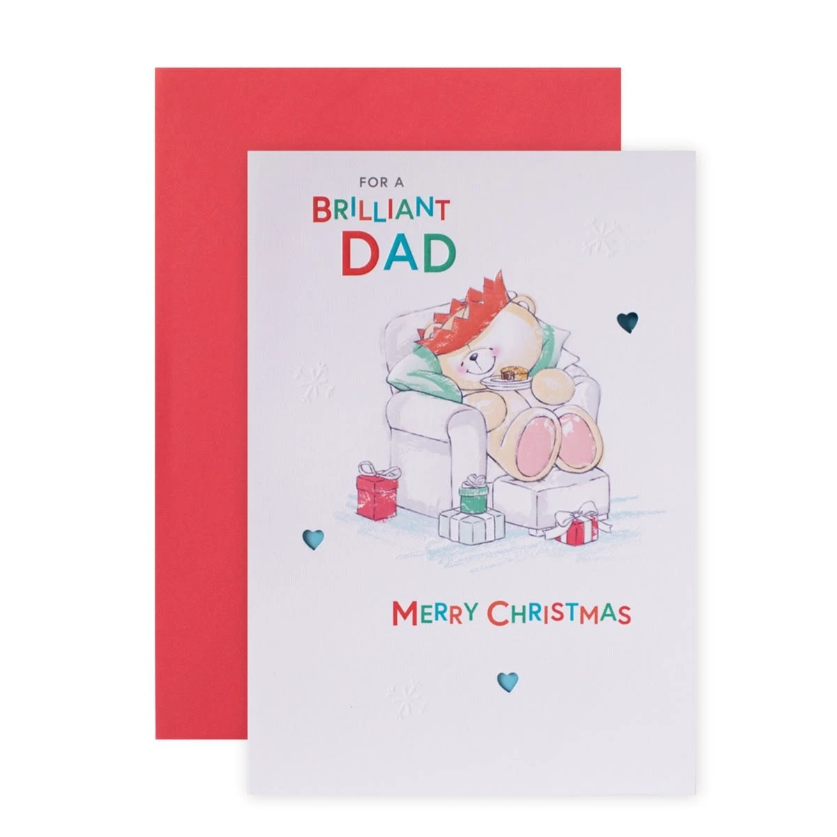 - The front of the card features embossed elements, laser cut love hearts, an illustration of a Forever Friends bear sitting in a comfy chair surrounded by gifts, and the message ‘FOR A BRILLIANT DAD MERRY CHRISTMAS’