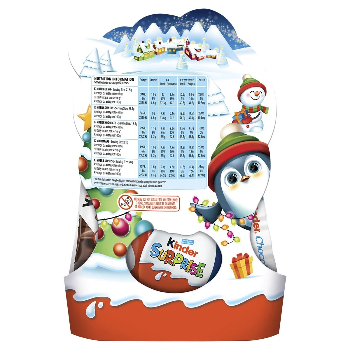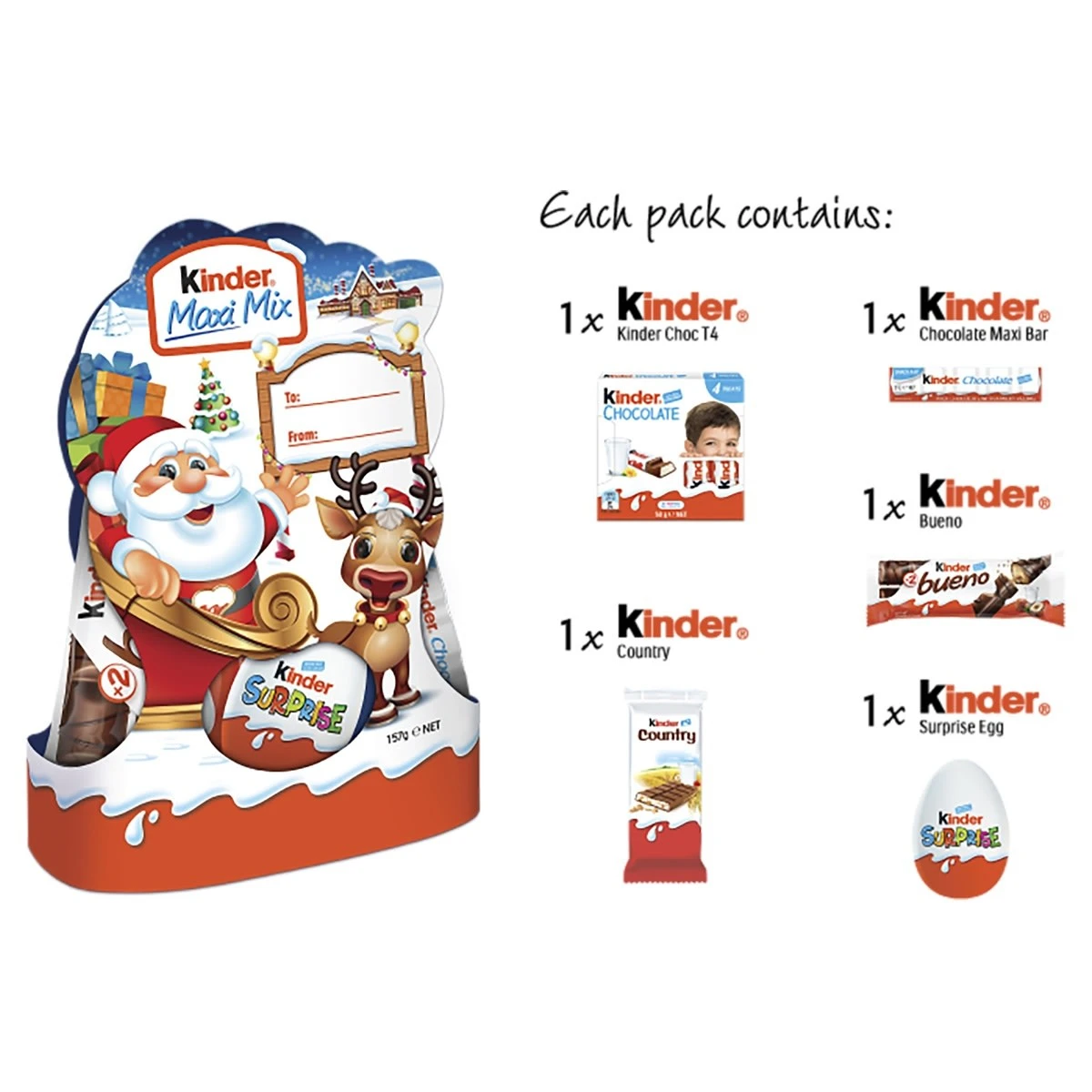 - Includes 1 x Kinder chocolate, 1 x Kinder chocolate Maxi bar, 1 x Kinder Country, 1 x Kinder Bueno and 1 x Kinder Surprise Egg