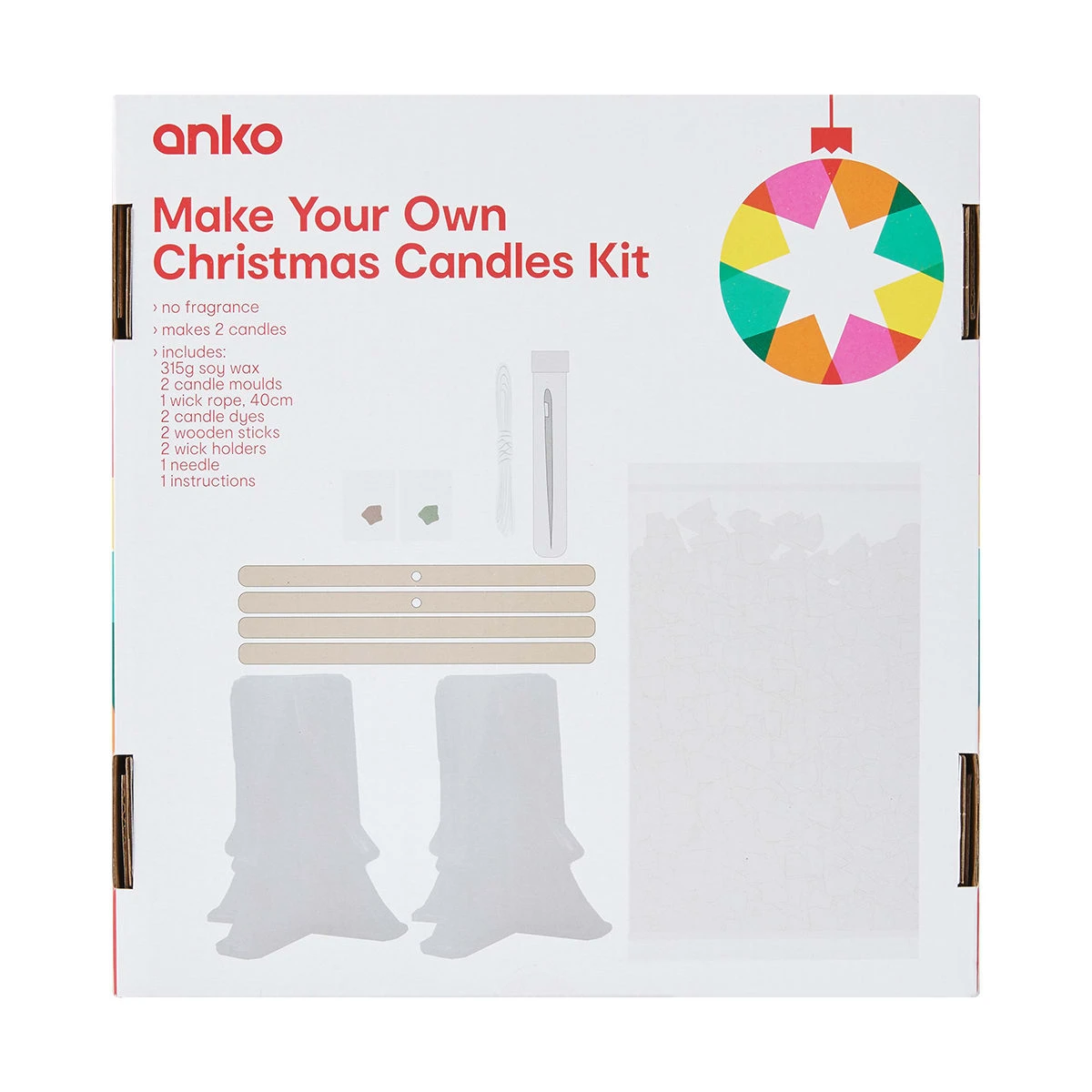 - Includes 315g soy wax, 2 x candle moulds, 1 x 40cm wick rope, 2 x candle dyes, 2 x wooden sticks, 2 x wick holders, 1 x needle and 1 x instructions