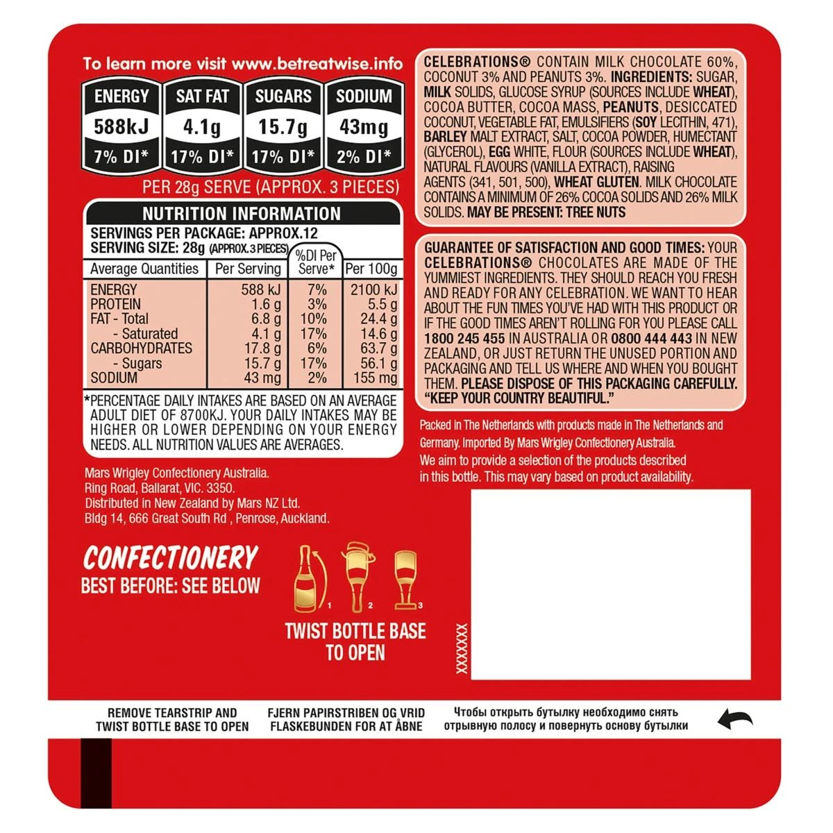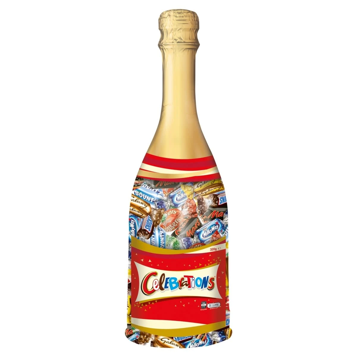 Celebrate good times and share the joy with this Celebrations Chocolate Champagne Gift Bottle that’s famous for bringing smiles! That’s because this Celebrations Champagne Bottle brims with the world’s most loved Mars chocolates in their individually wrapped bite-size forms. Maltesers Teaser, Mars, Bounty, Milky Way, Snickers, Galaxy and Galaxy Caramel join the bubbly Celebrations Chocolate party fun! Living up to its name, this Celebrations Bottle helps you commemorate life’s events and achievements, from thanking teachers and party hosts to saying congratulations after exams. The perfect Secret Santa and Kris Kringle chocolate gift, this Celebrations Bottle also looks fabulous on Christmas party tables! What’s more, it’s a deliciously special way to turn road trips and family movie nights into chocolate snack Celebrations! So grab a bottle of chocolates, share the joy and get celebrating today!